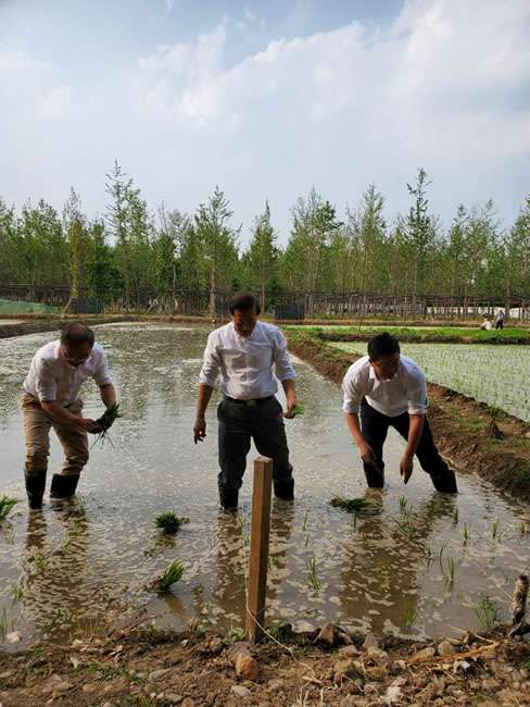日前,乐竞体育·乐竞网站登录官网入口-乐竞(中国)董事长梁雨、总裁谢俊率集团高级管理人员来到位于北京西四环外的锦绣大地生态园,在景色迷人的玉泉山山下,同志们挽起裤脚跃进田里,生态园农业技术员一边弓腰示范,一边讲解道“插秧是个技术活,将秧苗窝在虎口处,既要轻又要稳,用巧劲儿将秧苗抛在泥里,不能抛得太深,又要确保植保灌溉时,秧苗不漂浮在水面上。”